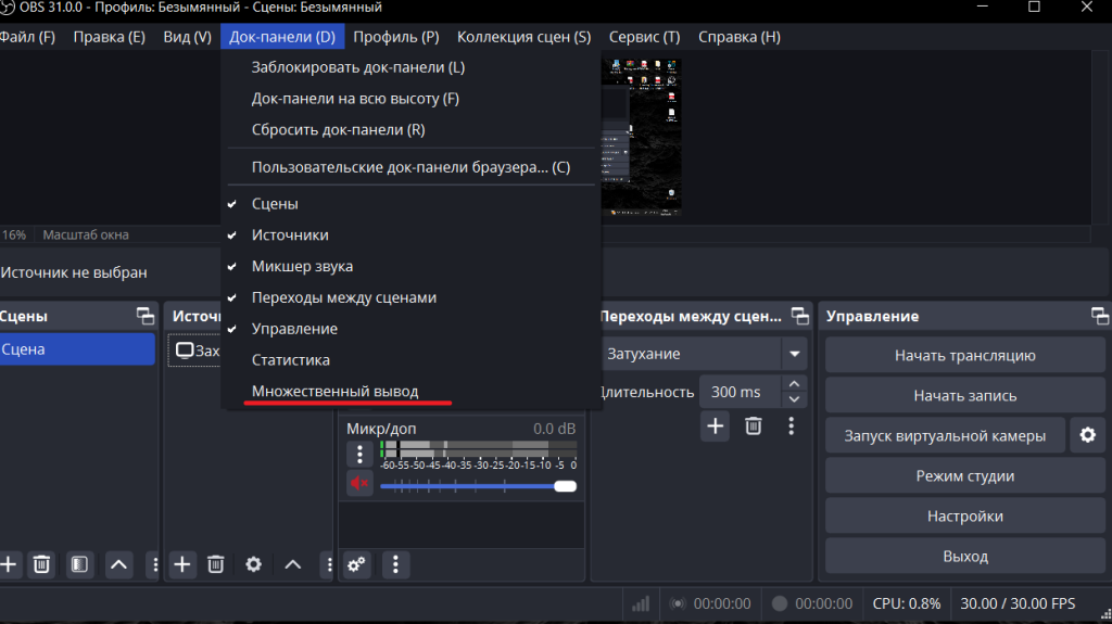 После установки файла открываем OBS и переходим во вкладку «Док Панели (D)» и открываем пункт «Множественный выбор».